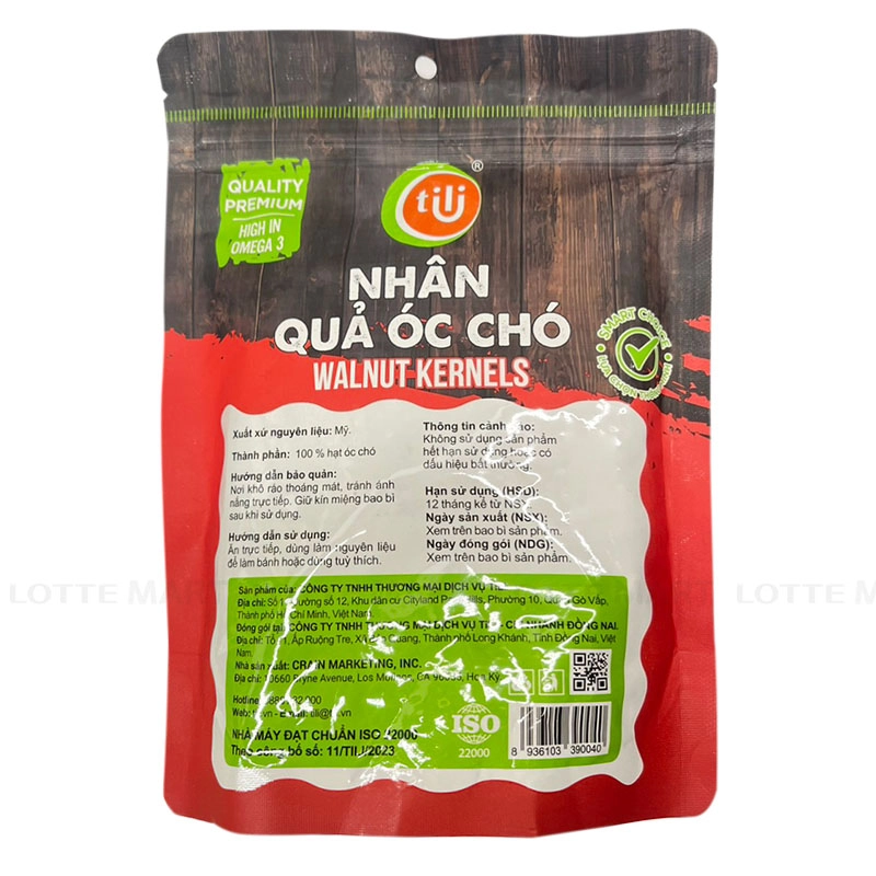 Hạt Óc Chó Tách Vỏ Tili Gói 100 G chứa các thành phần dinh dưỡng thiết yếu cho cơ thể như Omega 3, chất xơ, Protein, Photpho, Kali, Magnesium, Canxi, Sắt, Vitamin B, chất chống oxy hóa. Nguyên liệu hoàn toàn tự nhiên không chất bảo quản, được đóng gói đảm bảo vệ sinh an toàn thực phẩm.
