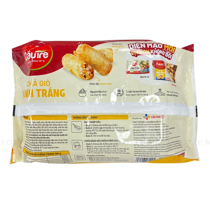 Thành phần: Chả giò nhân hải sản Cầu Tre 500G có chứa các thành phần dinh dưỡng như sau: Da bánh 24%, củ sắn, cá tra 12.5%, khoai môn, khoai lang, hành tím, tôm 4.5%, đạm đậu nành, nấm mèo,...