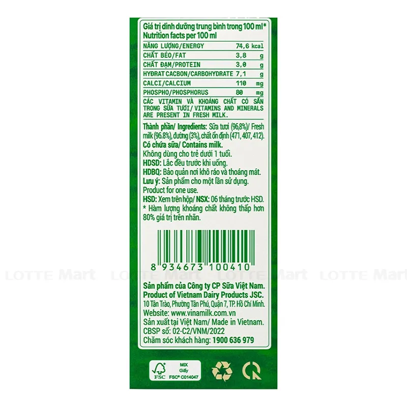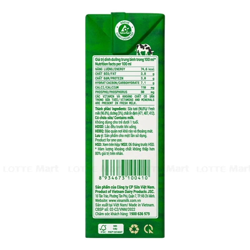 Thành phần: Sữa tươi, đường...Hàm lượng dinh dưỡng có trong 100ml sữa tươi Vinamilk Green Farm ít đường gồm: 110mg Canxi; 68,9 kcal Năng lượng; 3,0gram Chất đạm; 3,3gram Chất béo; 6,8gram Cacbon Hydrat và 80mg Phospho. Đảm bảo cung cấp đầy đủ dinh dưỡng và năng lượng để bạn tiếp tục học tập, hoạt động, làm việc.