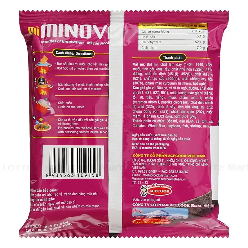 Mì Minova Tôm Xào Lá Chanh Gói 76G với sự kết hợp hài hòa giữa sợi mì không chiên cải tiến và nước súp đậm đà hương vị Việt Nam. Điểm đặc biệt của sản phẩm là sợi mì được cải tiến: sợi mì to, có độ mềm dẻo và trơn bóng rất tốt, thấm vị vừa phải, khi kết hợp với súp quen thuộc của hương vị Việt Nam thì tạo nên thực cảm mới ngon bất ngờ.