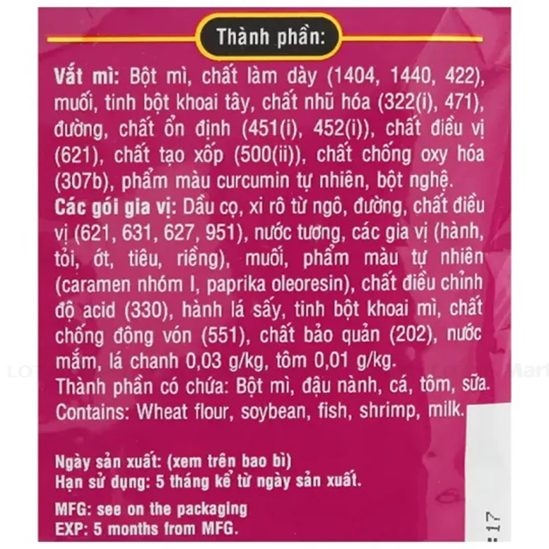 - Vắt mì - bột mì, chất làm dày, muối, tinh bột khoai tây, chất nhũ hóa, đường, chấy ổn định, chất điều vị, chất tạo xốp, chất chống oxy hóa, phẩm màu curcumin tự nhiên, bột nghệ.
