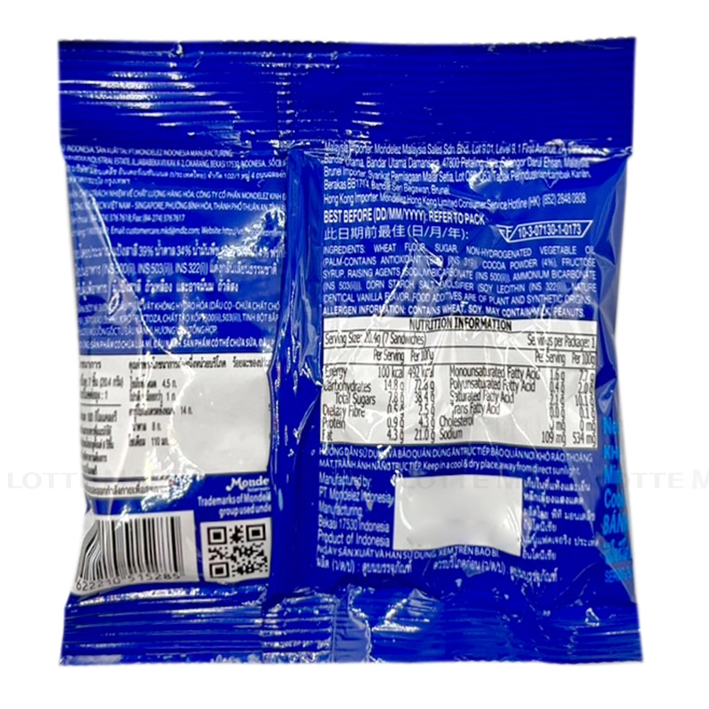 Thành phần: Bột mì, dầu thực vật không hydro hoá (dầu cọ), bột cacao 3.9%, siro fructose, chất tạo xốp, muối, bột bắp, chất nhũ hoá nguồn gốc từ đậu nành, hương vani giống tự nhiên. Bảo quản Để nơi khô ráo, thoáng mát, tránh ánh nắng trực tiếp. Nơi sản xuất: Indonesia.