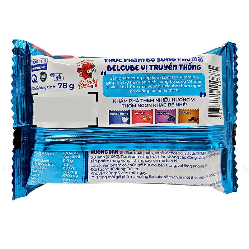 - Phô Mai Viên Belcube Vị Sữa được làm từ sữa gầy hoàn nguyên, phô mai, bơ và đạm sữa, bổ sung thêm canxi, kẽm, vitamin A và D.