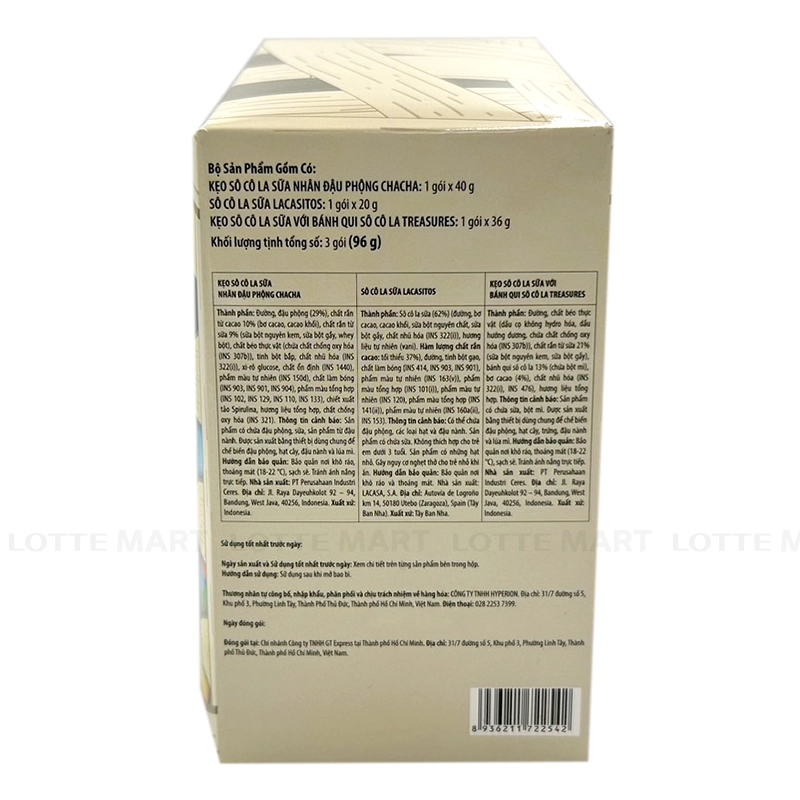 - Hộp socola Vali Halloween bao gồm ba loại sản phẩm thơm ngon: Socola sữa Lacasitos 20g, kẹo socola sữa nhân đậu phộng Chacha 40g và kẹo socola sữa với bánh quy socola Treasures 36g. Mỗi loại mang đến hương vị đặc trưng riêng biệt, từ độ ngọt ngào của sô cô la cho đến vị bùi béo của đậu phộng, tạo ra trải nghiệm vị giác phong phú và hấp dẫn.