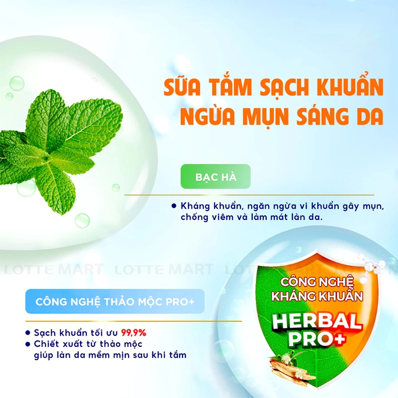 - Sữa tắm được sản xuất với công nghệ kháng khuẩn thảo mộc Herbal Pro+ giúp sạch khuẩn tối ưu đến 99.9%, tăng khả năng kháng khuẩn tự nhiên cho da.