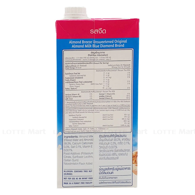 - Sữa hạnh nhân (nước lọc và hạnh nhân) (99.3%), canxi carbonate (0.3%), muối (0.1%), vitamin E (0.005%), phụ gia thực phẩm (chất ổn định (INS 332(ii)), chất nhũ hóa (INS 322(i)), chất làm dày (INS 418)), hương liệu giống tự nhiên (hương hạnh nhân).