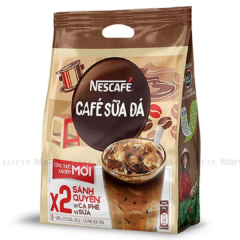 - Cà phê hòa tan NESCAFÉ Cà Phê Sữa Đá Bịch 25 Gói x 24g nhân đôi sánh quyện với công thức đặc biệt nhiều cà phê và sữa hơn, mang đến hương vị độc đáo thơm béo như pha phin, đậm ngon khó cưỡng.