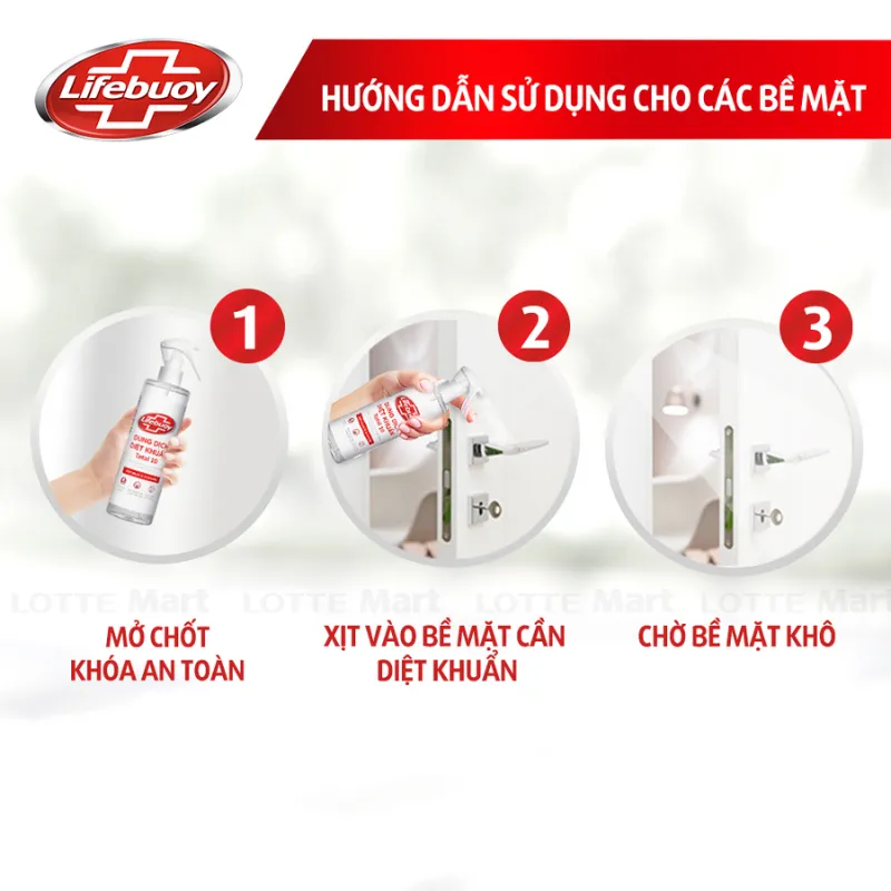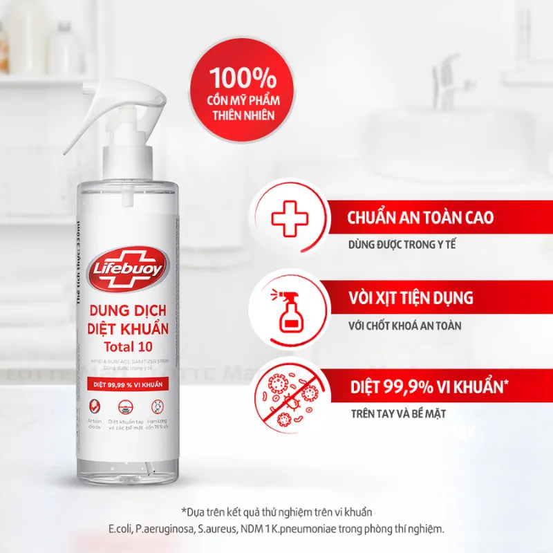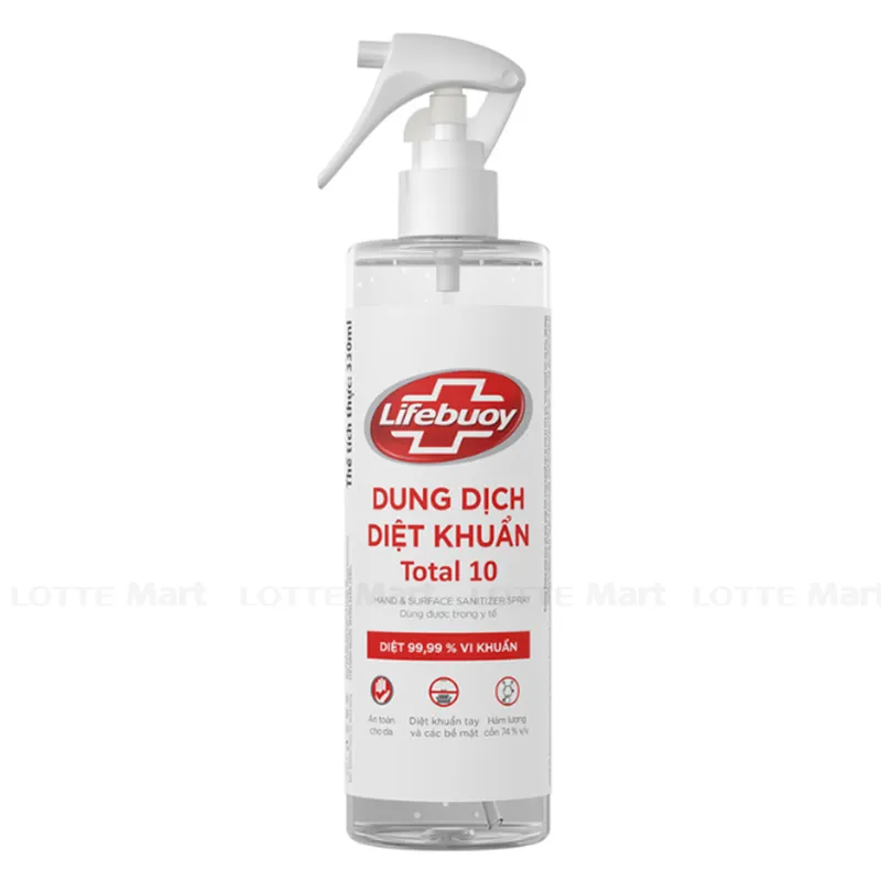 Xịt Diệt Khuẩn Lifebuoy Chai 330ml với 100% cồn mỹ phẩm thiên nhiên giúp diệt 99.9% vi khuẩn, được thiết kế vòi xịt tiện dụng với chốt khóa an toàn. Sản phẩm được duyệt và cấp phép bởi VIHEMA và bộ y tế
