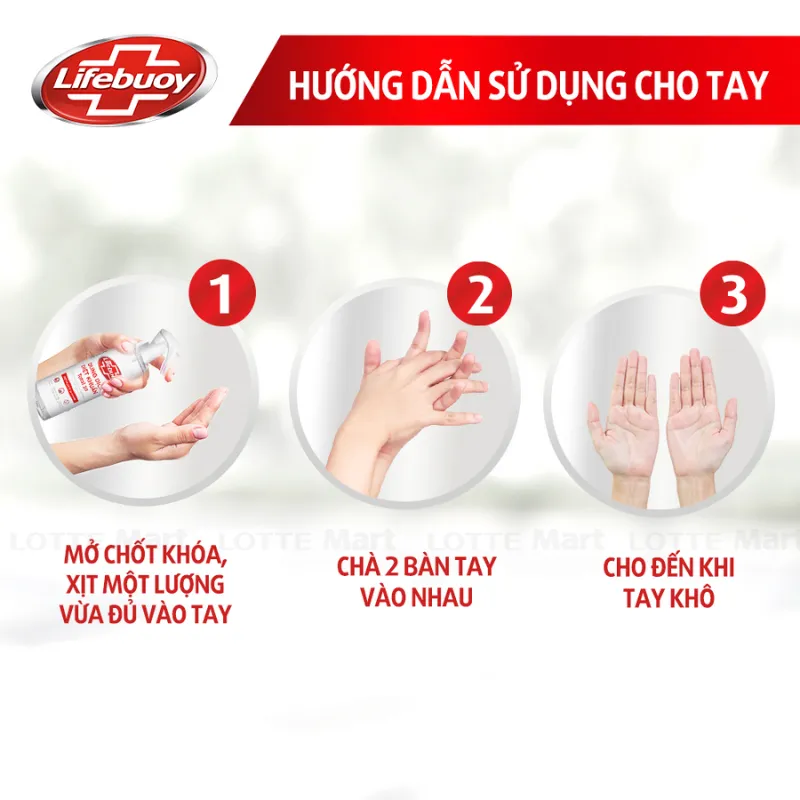 Hướng dẫn sử dụng: Dùng 3-5ml (Tương đương với 2 lần bóp thân chai) cho mỗi lần sử dụng. Xoa đều để đảm bảo từ cổ tay xuống đến đầu ngón tay thấm đều sản phẩm và khô tự nhiên, không cần rửa lại với nước. Thời gian sửa dụng sản phẩm tối thiểu 30 giây.