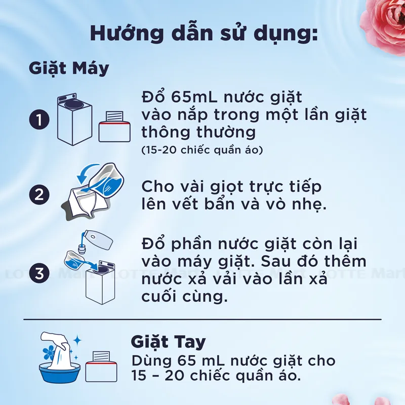 Hướng dẫn sử dụng: Giặt tay: 15ml cho 5 - 7 chiếc quần áo. Giặt máy: 45ml cho 1 lần giặt thông thường (15 - 20 chiếc quần áo). Sử dụng tốt nhất 18 tháng kể từ ngày sản xuất. Xuất xứ: Việt Nam.