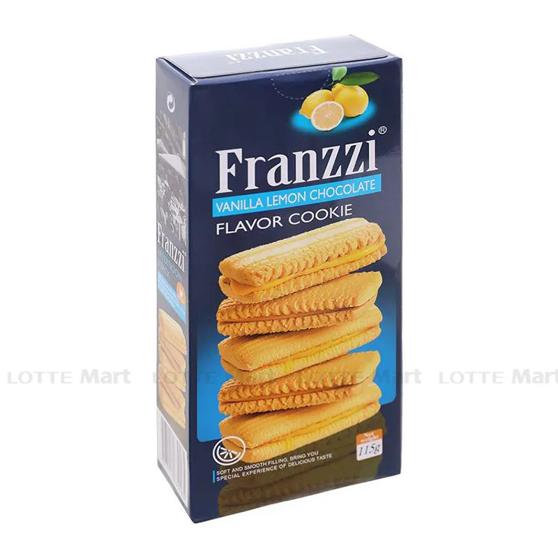 Bánh quy Franzzi là loại bánh tuyệt vời cho bữa ăn vặt của bạn. Bánh quy vị sô cô la chanh vani Franzzi hộp 115g với vị socola kết hòa quyện với vị chanh vani tan chảy trong khóe miệng ngay lần chạm đầu tiên. Bánh quy không mềm cũng không quá cứng, kem kẹp ở giữa vị ngọt thanh không quá gắt.