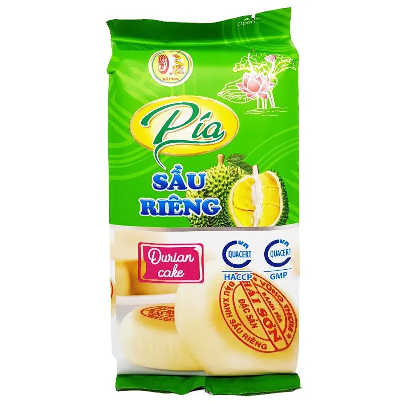 Thành phần: Đậu xanh, đường cát trắng, bột mì, sầu riêng (7%), mỡ heo, lòng đỏ hột vịt muối, dầu thực vật, muối, nước, màu đỏ ponceau 4R (124).
