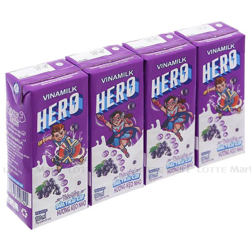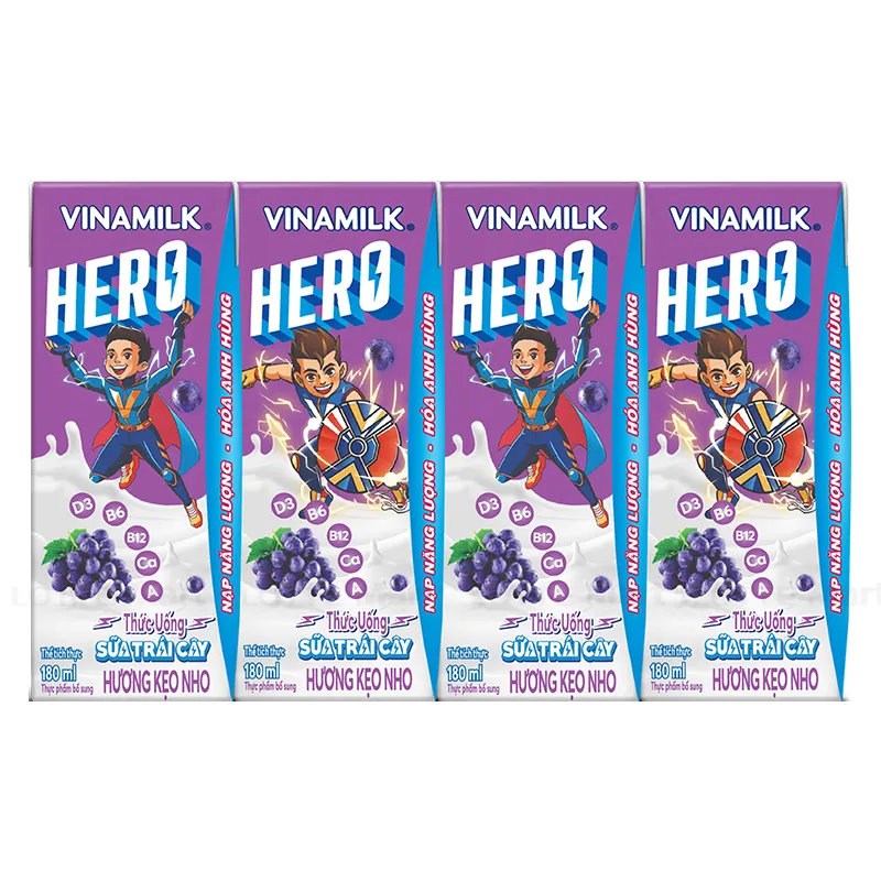 Lốc 4 hộp sữa trái cây kẹo nho Vinamilk Hero 180ml