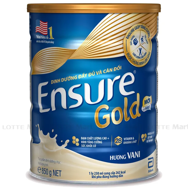 Sản phẩm sữa dành cho người lớn, người ăn uống kém, phụ nữ sau sinh và những người bệnh cần phục hồi nhanh. Cách dùng: Pha 230ml cho 195ml nước chín nguội vào ly, vừa cho từ tư 6 muỗng gạt ngang (muỗng có sẵn trong hộp) hay 53,8g bột Ensure Gold vừa khấy đều cho đến khi bột tan hết. 1ml Ensure Gold cung cấp 1kcal. Hộp 850g bột có thể pha được 15,8 ly mỗi ly khoảng 230ml. Xuất xứ thương hiệu: Mỹ. Sản xuất: Singapore.