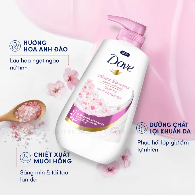 - Với chiết xuất hoa anh đào và muối hồng, Sữa Tắm Dove Hương Hoa Ngọt Ngào nhẹ nhàng làm sạch, cho da mềm mịn và lưu hương hoa anh đào ngọt ngào tươi mát sau mỗi lần tắm.