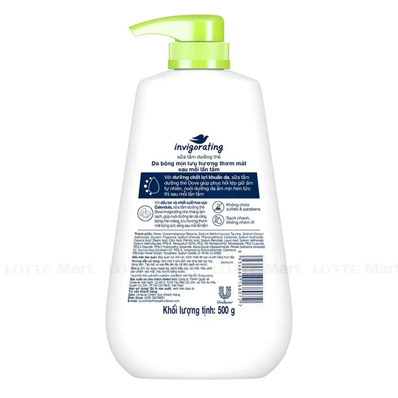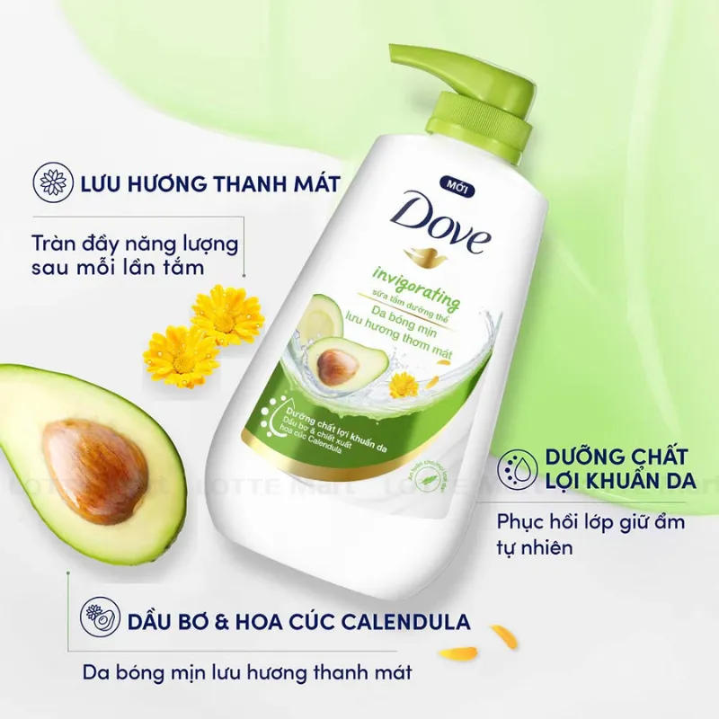 Sữa Tắm Dưỡng Thể Dove Dầu Bơ Và Hoa Cúc Da Mịn Thơm Mát 500g với dầu bơ và chiết xuất hoa cúc Calendula nhẹ nhàng làm sạch, giúp nuôi dưỡng làn da căng bóng mịn màng, lưu hương thơm mát bừng sức sống sau mỗi lần tắm.
