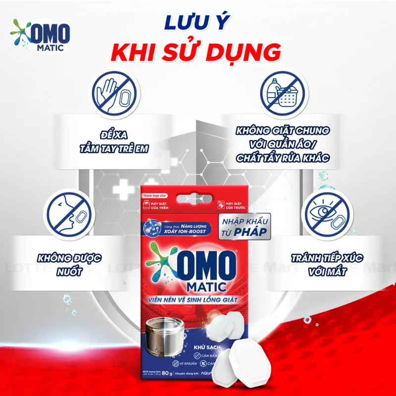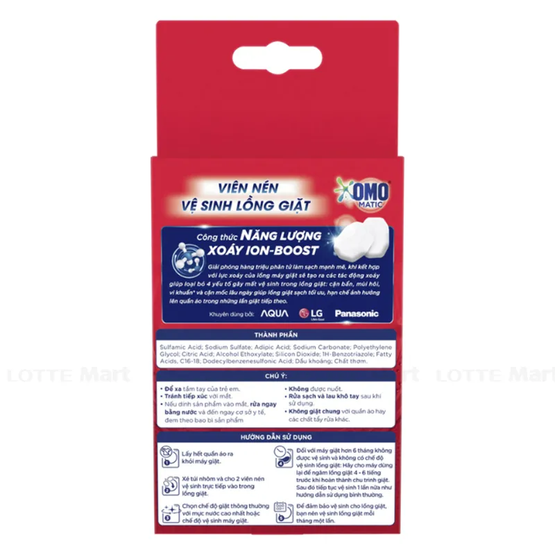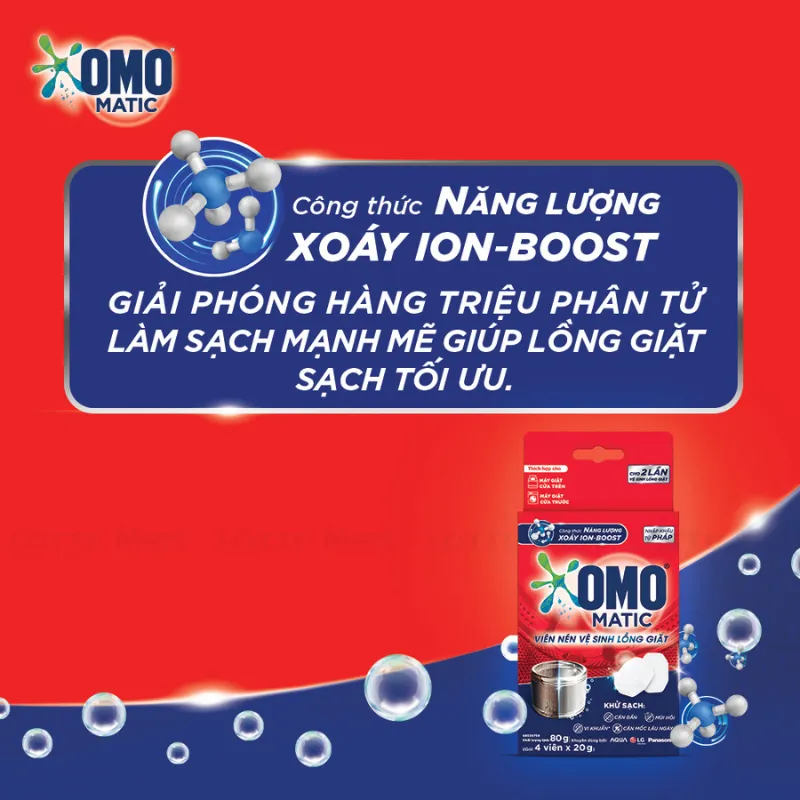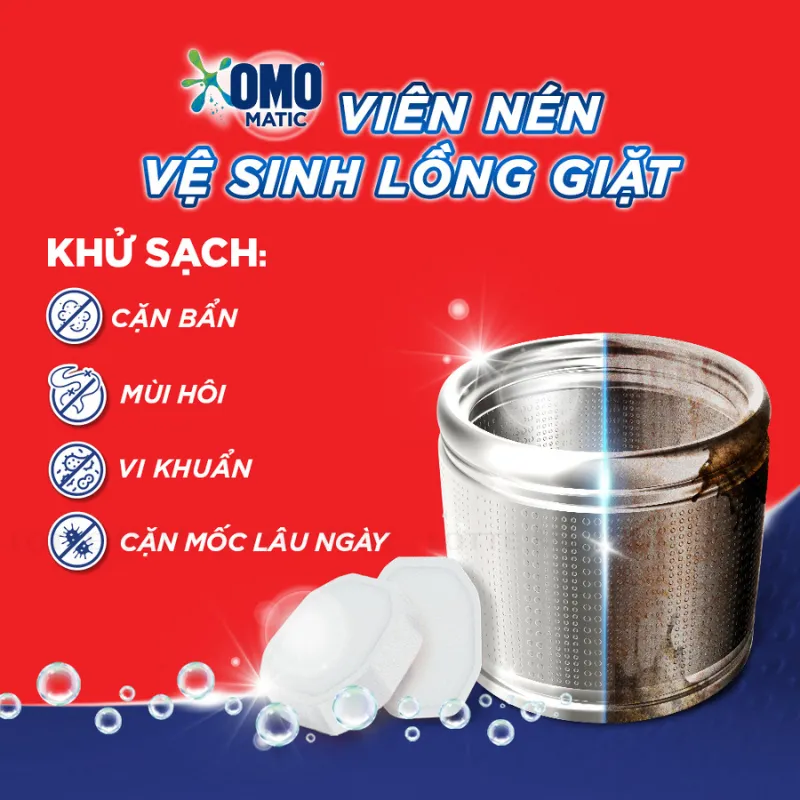 Viên Tẩy Lồng Máy Giặt Omo với công thức năng lượng xoáy ION-BOOST giúp giải phóng hàng triệu phân tử làm sạch mạnh mẽ, khi kết hợp với lực xoáy của lồng giặt sẽ tạo ra tác động xoáy giúp loại bỏ 4 yếu tố gây mất vệ sinh trong lồng giặt: cặn bẩn, mùi hôi, vi khuẩn và cặn mốc lâu ngày.