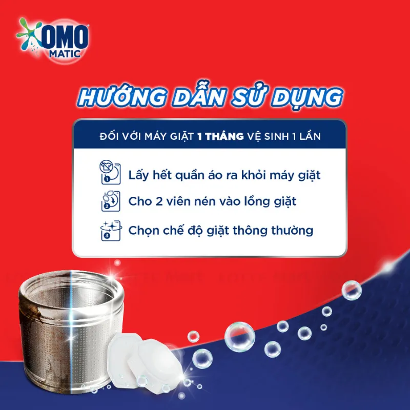 Hướng dẫn sử dụng: Lấy hết quần áo ra khỏi máy giặt. Xé túi nhôm và cho 2 viên nén vệ sinh trực tiếp vào trong lồng giặt. Chọn chế độ giặt thông thường với mực nước cao nhất hoặc chế độ vệ sinh máy giặt. Riêng đối với máy giặt 6 tháng chưa vệ sinh: Hãy cho máy dừng lại sau 30 phút để ngâm lồng giặt từ. 4-6 tiếng trước khi hoàn thành chu trình giặt. Để đảm bảo vệ sinh cho lồng giặt, bạn nên vệ sinh lồng giặt mỗi tháng một lần.