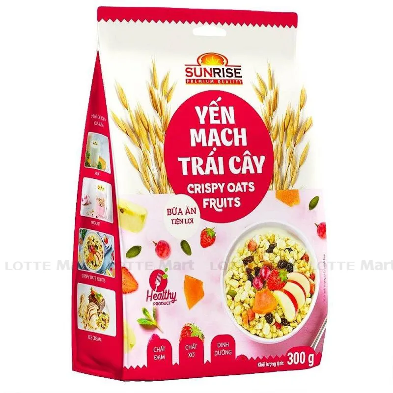 Yến mạch trái cây được kết hợp với yến mạch nướng và trái cây sấy thơm ngon, hấp dẫn. Yến mạch trái cây Sunrise Muesli bịch 300g cung cấp cho bạn bữa ăn sáng hoặc bữa ăn phụ ngon miệng, hỗ trợ giảm cân. Yến mạch Sunrise chất lượng, tiện lợi ăn kèm với sữa tươi và sữa chua sẽ ngon hơn.
