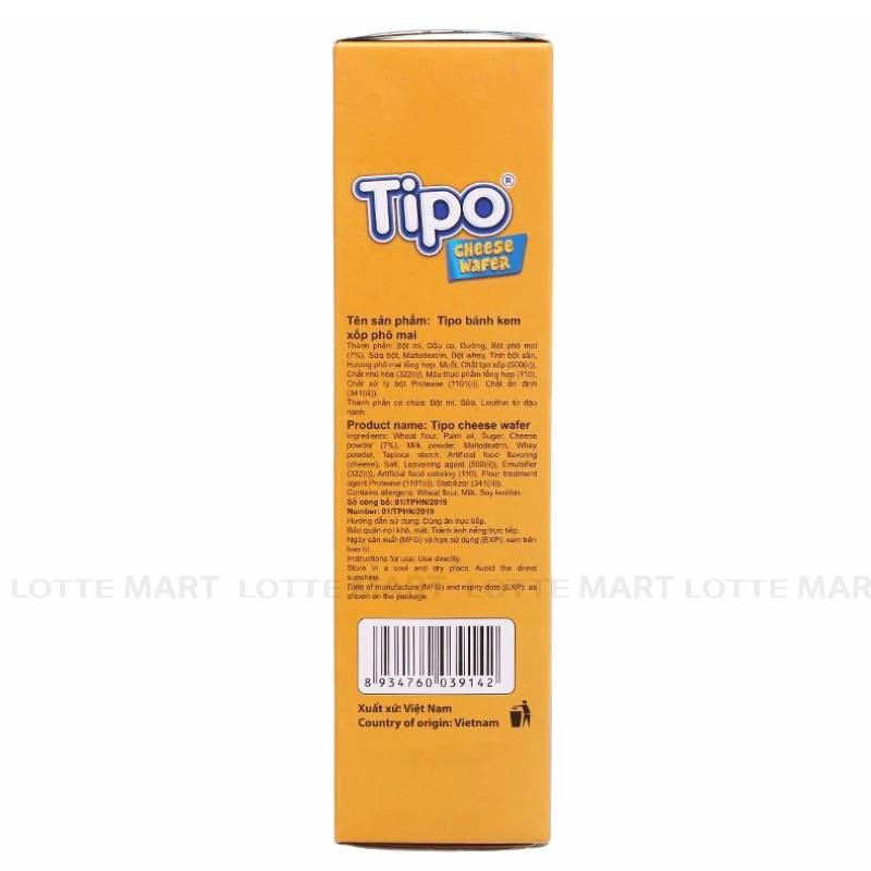 - Bánh Xốp Tipo Vị Phô Mai là sự kết hợp của lớp bánh giòn xốp cùng lớp kem phô mai beo béo hòa quyện cùng nhau. Sản phẩm giúp cung cấp năng lượng cho cơ thể, đồng thời chứa các chất dinh dưỡng như Vitamin B1, B2 và chất xơ, canxi, sắt.