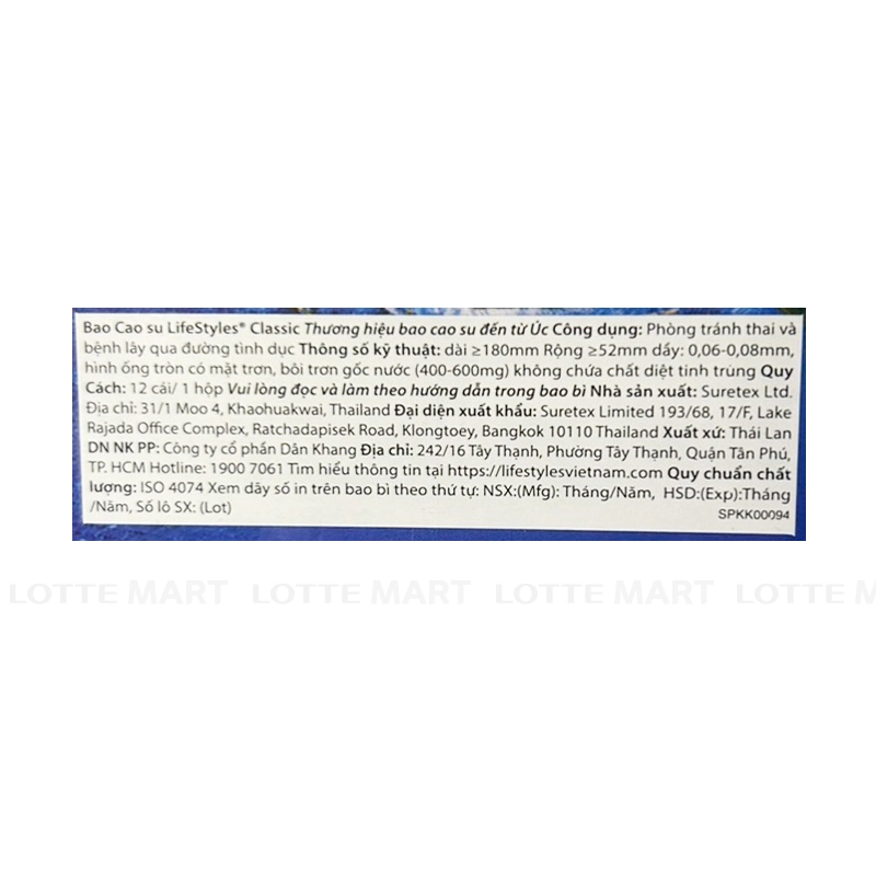- Bao Cao Su Lifestyles Classic Hộp 12 Cái đạt tiêu chuẩn chất lượng quốc tế, an toàn và hiệu quả; được sản xuất hoàn toàn bằng chất liệu mủ cao su thiên nhiên, đáp ứng những yêu cầu và điều kiện sản xuất khắt khe dành cho sản phẩm nhạy cảm.