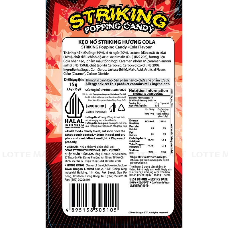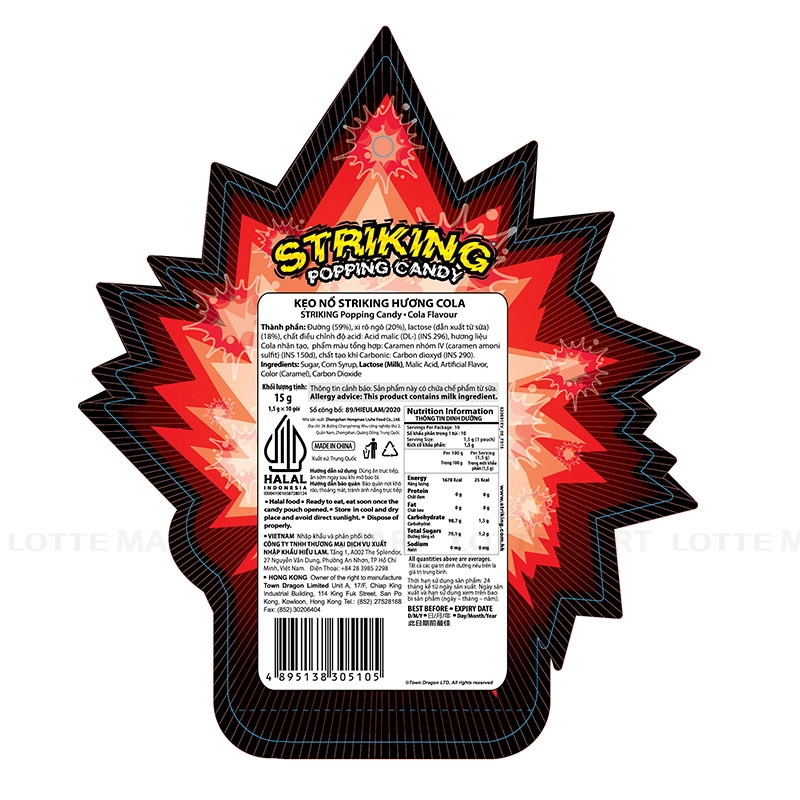 Kẹo nổ Striking được sản xuất tại Hồng Kông, trên dây chuyền sản xuất hiện đại, hợp vệ sinh và đóng gói đẹp mắt.
