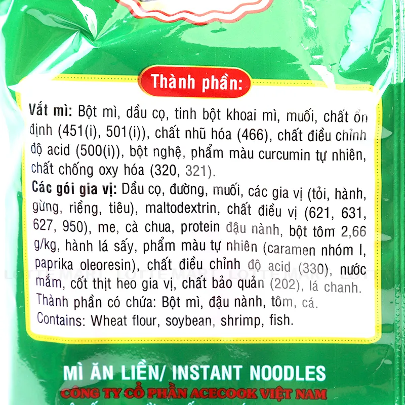 - CÁC GÓI GIA VỊ - Dầu thực vật (dầu cọ, chất chống oxy hoá (BHA (320), BHT (321))), đường, muối, hành, các gia vị, chất điều vị (mononatri glutamat (621), dinatri 5'-inosinat (631), dinatri 5'-guanylat (627), disodium succinate), cà chua, me, maltodextrin, tôm 2,75 g/kg, hành lá sấy, chất tạo màu tổng hợp (caramen nhóm I (150a), paprika oleoresin (160c)), thịt heo, lá chanh, chất tạo ngọt tổng hợp (acesulfam kali (950)), chất bảo quản (kali sorbat (202)).