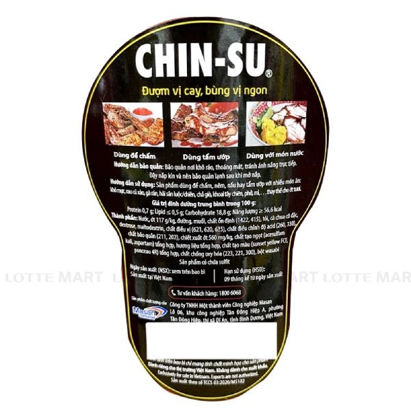 - Nước, đường, ớt 110 g/kg, muối, chất làm dầy (1422), tỏi, cà chua cô đặc, dextroza, maltodextrin, chất điều vị (621, 620, 635), chất điều chỉnh độ axit (260, 330), chất ổn định (415), chất bảo quản (211, 202), gia vị hỗn hợp, chất tạo ngọt tổng hợp (acesulfame potassium, aspartame), hương liệu tổng hợp, chất tạo màu tổng hợp (sunset yellow FCF, ponceau 4R), chất chống oxy hoá (223, 221, 300), bột wasabi, sunfit.