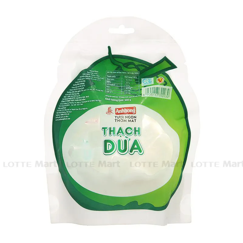 Thạch dừa giòn giòn dai dai, thơm mùi dừa lại có màu trắng tinh khiết hấp dẫn.Thạch Dừa Ánh Hồng Túi 900g thơm ngon, mát lạnh ăn kèm với đá lạnh vào ngày hè vô cùng sảng khoái. Thạch dừa Ánh Hồng thơm ngon, chất lượng, được cả trẻ em và người lớn yêu thích. Thành phần: Thạch dừa 45%, nước 40%, đường 14%, chất điều chỉnh độ chua E330, chất bảo quản E211, hương vải tổng hợp... Năng lượng: 56kcal/100g. Cách dùng: Dùng ngay sau khi mở bao bì. Ngon hơn khi dùng lạnh. Cẩn thận khi dùng cho trẻ dưới 5 tuổi. Bảo quản: Để ở nơi khô ráo, thoáng mát, tránh ánh nắng trực tiếp. Nơi sản xuất: Việt Nam. Lưu ý: Đậy kín sản phẩm sau khi mở bao bì. Nên bảo quản lạnh sau khi mở bao bì.