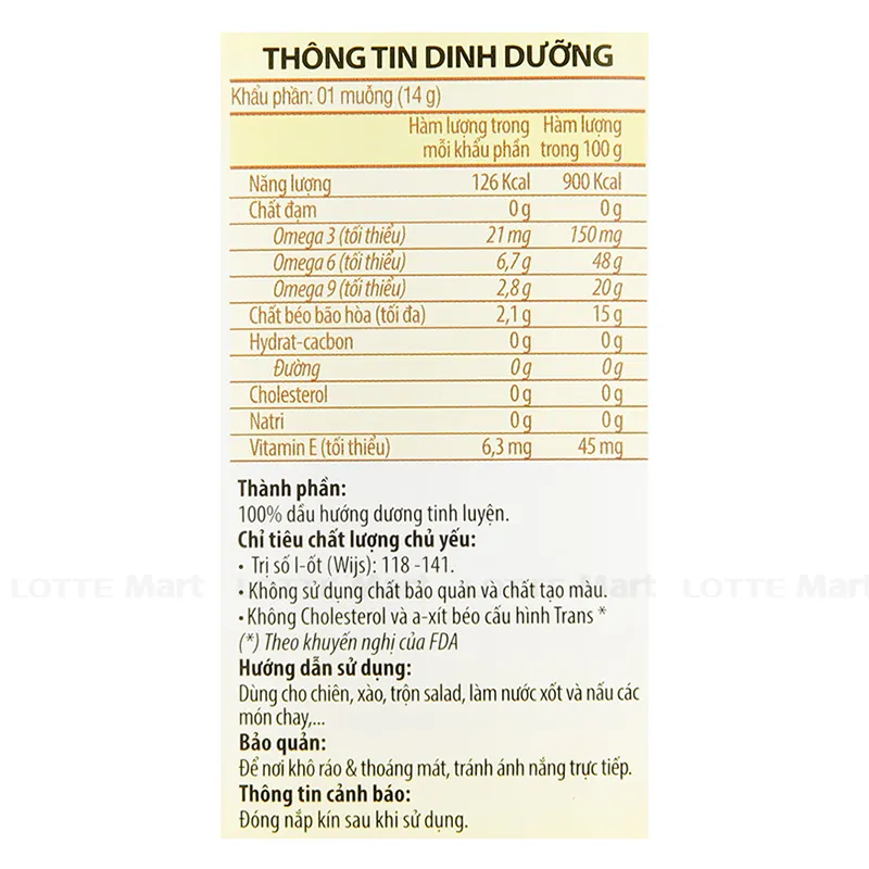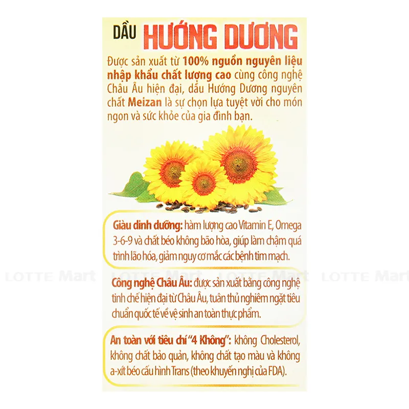 Dầu hướng dương sản xuất theo công nghệ của Châu Âu, đạt chuẩn vệ sinh an toàn thực phẩm. Sản phẩm đảm bảo an toàn cho người dùng với tiêu chí "4 Không": Không Cholesterol, không chất bảo quản, không chất tạo màu và a-xít béo cấu hình Trans.