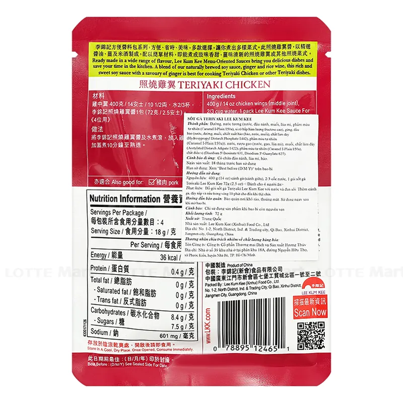 Sốt Gà Teriyaki Lee Kum Kee Gói 72G là lựa chọn thông minh của rất nhiều người nội trợ hiện nay, có xuất xứ từ Hong Kong, kết hợp hoàn hảo giữa nước tương đậm đặc, hương thơm nồng ấm của gừng và rượu gạo giúp món gà Teriyaki thêm thơm ngon, hấp dẫn, tiết kiệm thời gian nấu nướng.