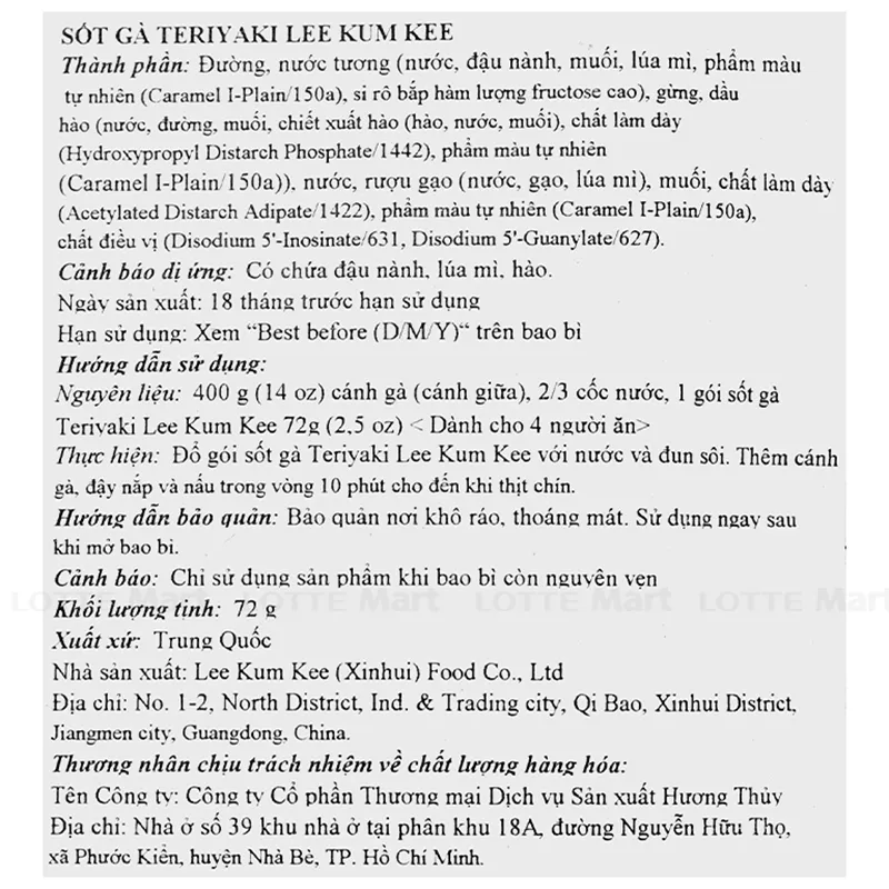 - Đường, nước tương, gừng, dầu hào, chiết xuất hào, si rô bắp, phẩm màu tự nhiên, nước, rượu gạo, muối,... Sản phẩm có chứa đậu nành, lúa mì và hào.
