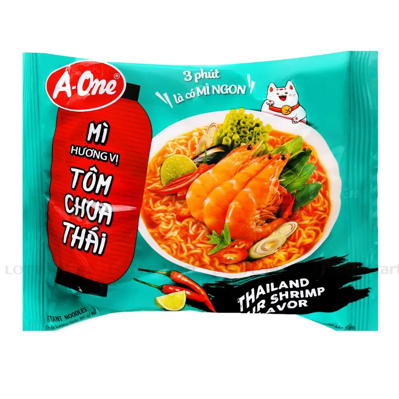 Mì A-one tôm chua Thái được sản xuất trên quy trình công nghệ hiện đại, được kiểm duyệt chặt chẽ, đảm bảo chất lượng. Mang hương vị tôm thơm ngon kết hợp sợi mì dai và ngon tuyệt. Sản phẩm cung cấp hàm lượng tinh bột, protein đáng kể và cung cấp nguồn năng lượng dồi dào cho cơ thể suốt ngày dài hoạt động.