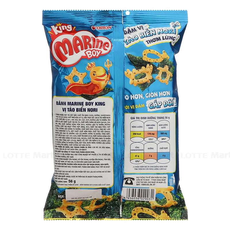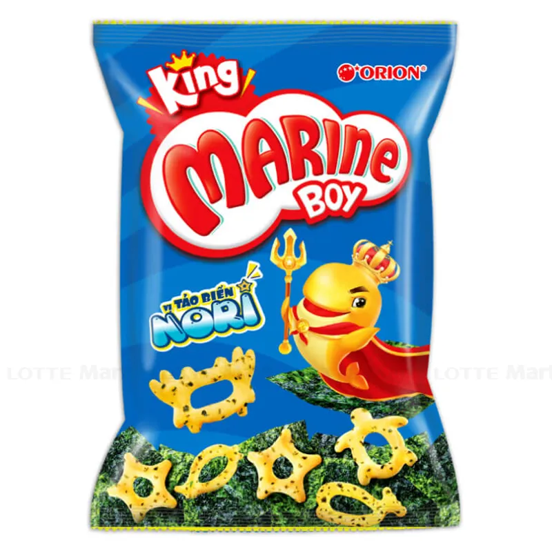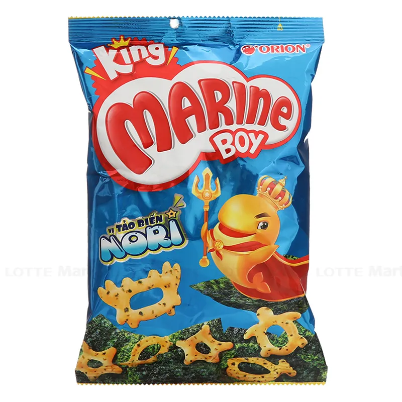 - Snack Vị Tảo Biển Nori King Marine Boy với vị tảo biển thơm ngon, miếng snack giòn rụm hấp dẫn. Snack Orion là thương hiệu nổi tiếng uy tín với các sản phẩm bánh kẹo đa dạng, hình dáng ngộ nghĩnh, bắt mắt.