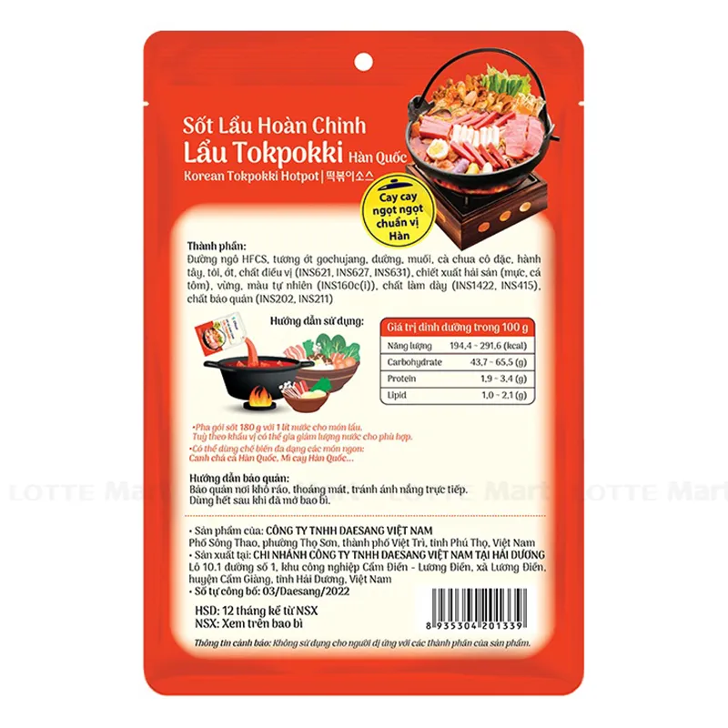 Sốt Lẩu Tokpokki Hàn Quốc O'Food Gói 180G được làm từ sự hòa quyện và phối trộn giữa nhiều nguyên liệu và gia vị như tương ớt gochujang, đường, muối, cà chua cô đặc, tỏi, ớt, chiết xuất hải sản...tạo nên nước cốt lẩu tokbokki cay đỏ, đậm đà vừa ăn.