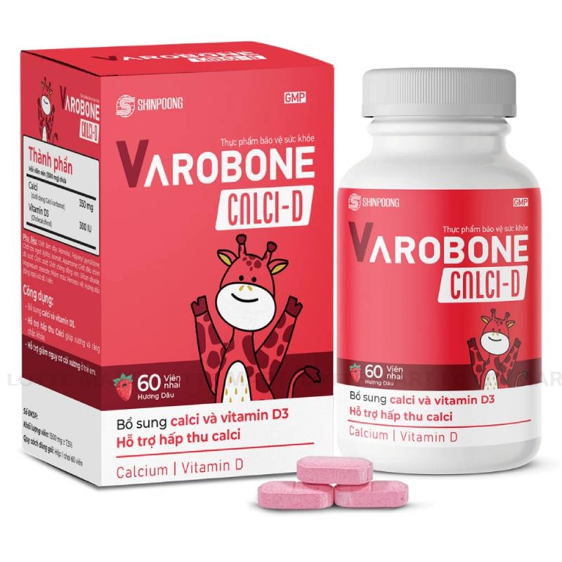 - Thực Phẩm Bảo Vệ Sức Khỏe Shinpoong Varobone Calci D Bổ Sung Canxi Và Vitamin D3 Cho Trẻ Em là sản phẩm của công ty dược phẩm có bề dày lịch sử lâu đời tại Hàn Quốc - Shinpoong Pharma. Sản phẩm được thiết kế đặc biệt cho trẻ em nhằm bổ sung canxi và vitamin D3.