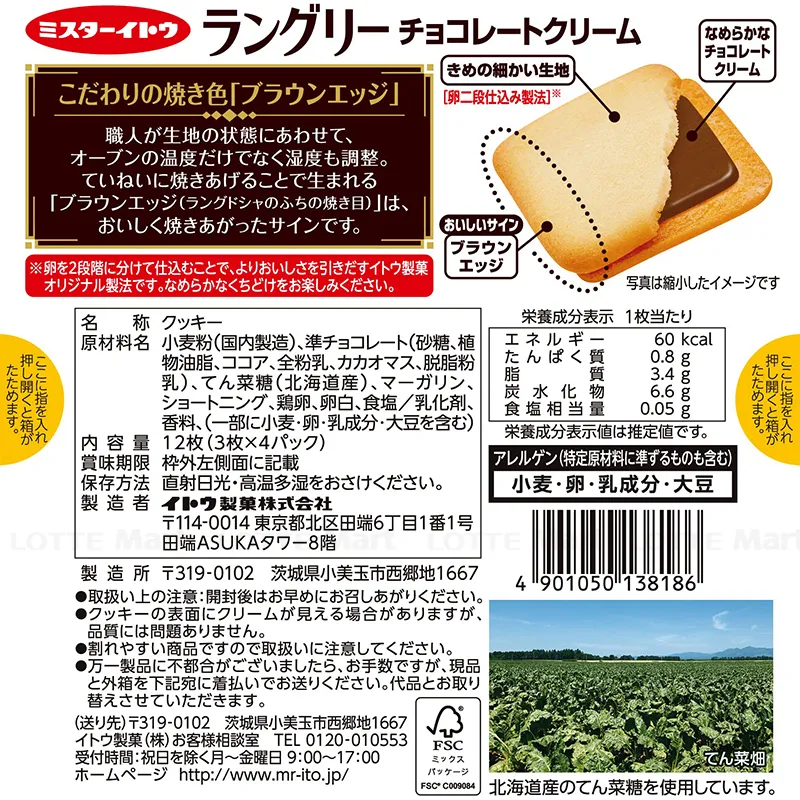 - Bột mì (sản xuất trong nước), bán sô-cô-la (đường, dầu thực vật, ca cao, sữa bột nguyên kem, cacao mass, sữa bột gầy), đường củ cải (sản xuất tại Hokkaido), bơ thực vật, mỡ, trứng, lòng trắng trứng, muối/chất nhũ hóa, hương liệu, (trong một số trường hợp) (Chứa lúa mì, trứng, nguyên liệu sữa và đậu nành).