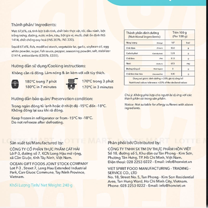 • Chả mực - Không rã đông, chiên ngập trong dầu ở nhiệt độ 170-175°C, thời gian 2-3 phút khi sản phẩm có màu vàng.