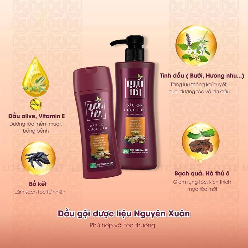 - Dầu Gội Dược Liệu Nguyên Xuân Dành Cho Tóc Thường là sản phẩm dầu gội đến từ thương hiệu Nguyên Xuân - Việt Nam. Sản phẩm được chiết xuất từ các loại dược liệu quý giúp dưỡng tóc và da đầu, giúp cho tóc khỏe, không bị khô xơ, chẻ ngọn, cho mái tóc mềm mại, suôn mượt, giảm gãy rụng tóc và góp phần hỗ trợ mọc tóc mới cho tóc dày và đen hơn.