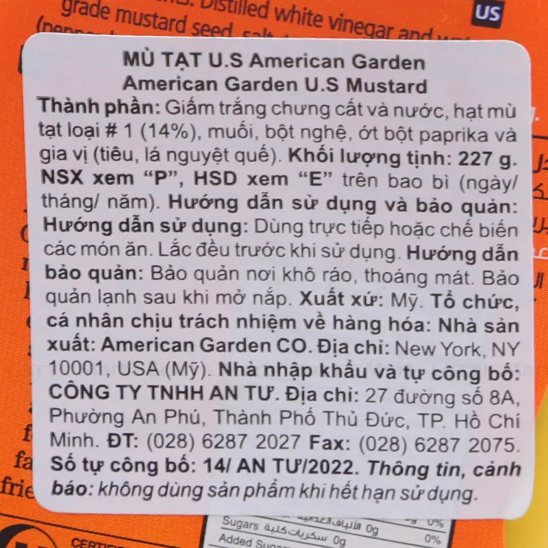 Mù tạt vàng được sản xuất trên dây chuyền công nghệ hiện đại, dưới sự giám sát của các chuyên gia hàng đầu của Mỹ. Mỗi sản phẩm do American Garden phân phối đều đảm bảo được đầy đủ các tiêu chuẩn về chất lượng và vệ sinh an toàn thực phẩm, sản phẩm được người tiêu dùng ưa thích và tin tưởng.