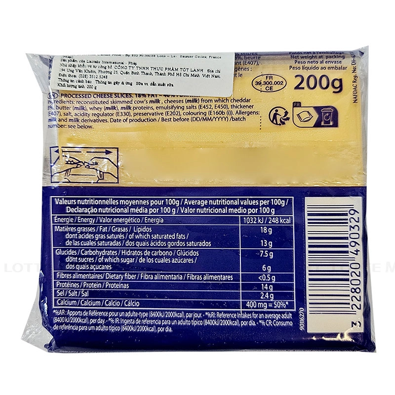 Thành phần: Sữa bò tách béo hoàn nguyên, phô mai (sữa) trong đó cheddar 8%, bơ (sữa), whey (sữa), đạm sữa, muối nhũ hóa (E452 (INS 452(i), E450 (INS450(iii))), chất làm dày (E407) (INS407), muối, chất điều chỉnh độ acid (E330), (INS330), chất bảo quản (E202) (INS202), phẩm màu tự nhiên (E160b(i)) (INS160b(i)).