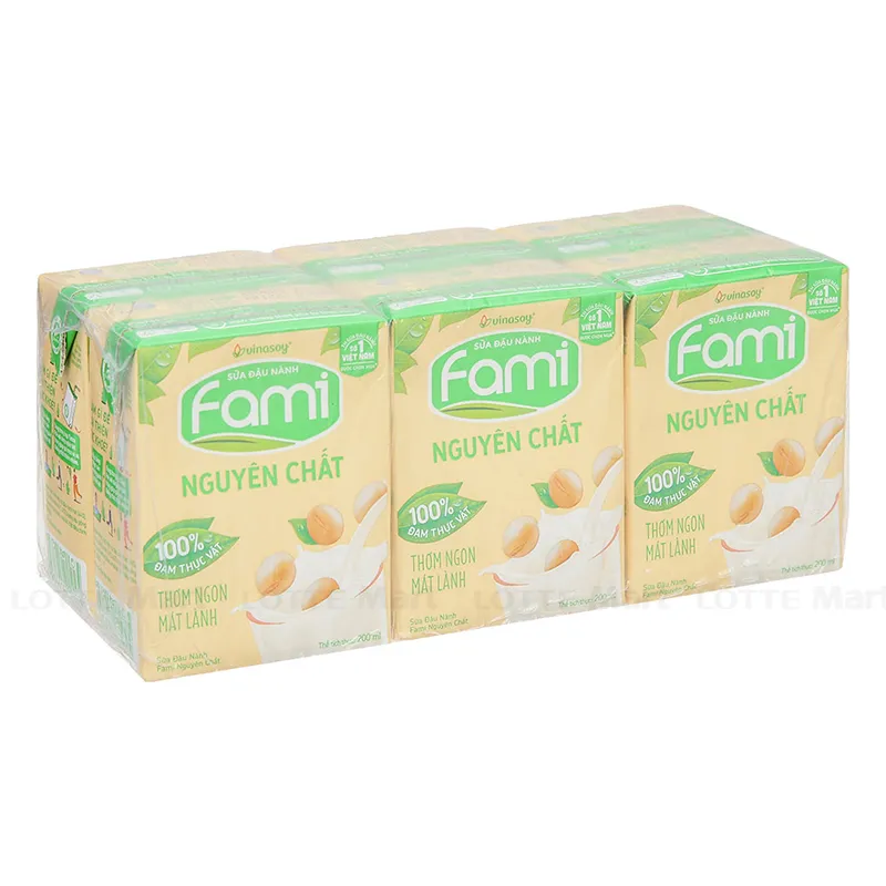- Sữa Đậu Nành Vinasoy Fami Nguyên Chất Có Đường Lốc 6 Hộp 200ml từ 100% đậu nành hạt chọn lọc mang đến 100% đạm thực vật, không chỉ thơm ngon, mát lành mà còn là lựa chọn tuyệt vời để cân bằng đạm cho cả gia đình.