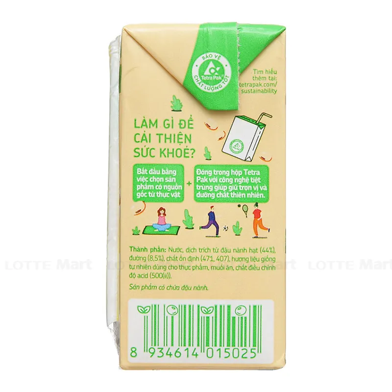 - Nước, dịch trích từ đậu nành hạt (38%), đường kính trắng (9%), chất điều chỉnh độ pH (500ii), chất ổn định (E407)