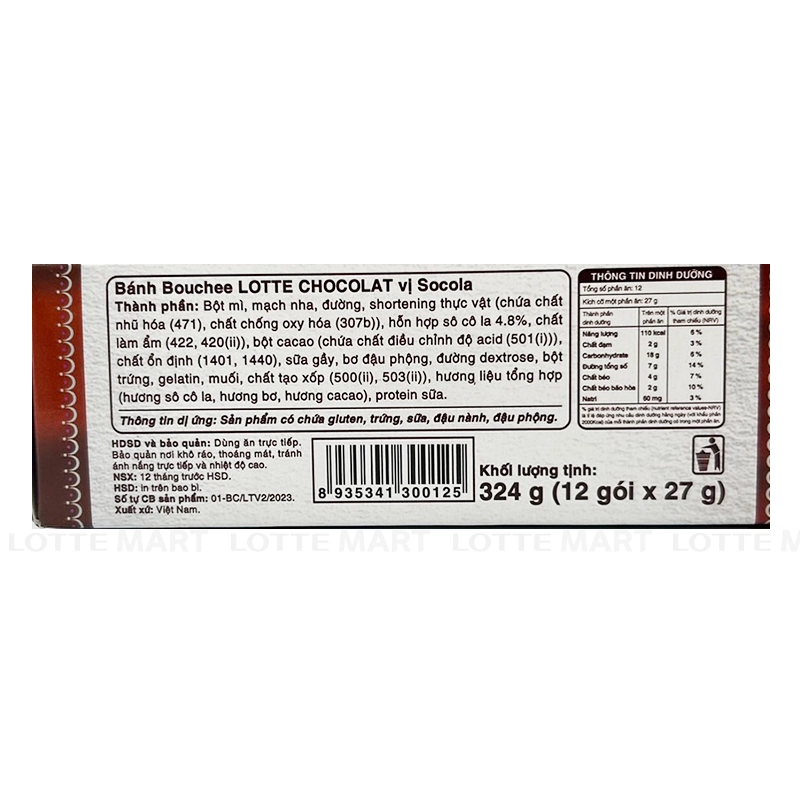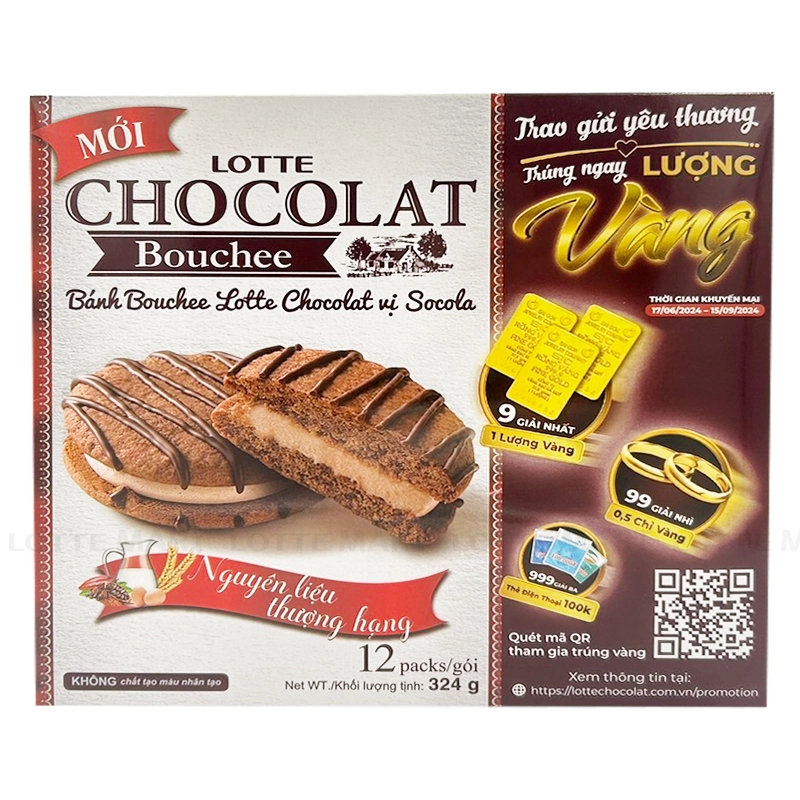 Bánh Lotte Chocolate Bouchee Vị Socola 12 Cái Hộp 324g với lớp bánh mềm, được phủ sốt socola đặc trưng bên ngoài cùng với lớp nhân marshmallow cao cấp dai dai, ngọt nhẹ bên trong tạo nên hương vị hấp dẫn, sản phẩm này chắc chắn sẽ làm các bạn làm mê ngay từ miếng đầu tiên.