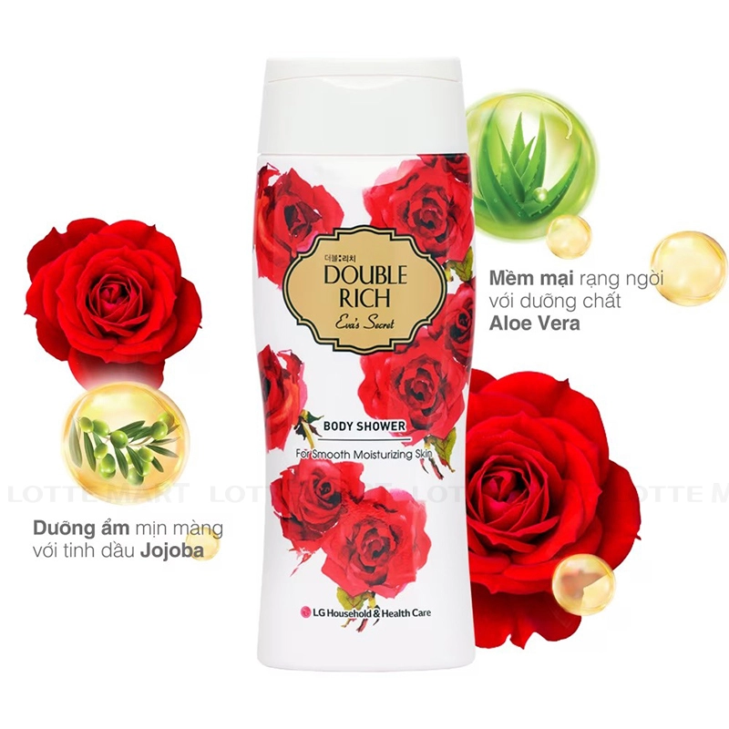 - Sữa tắm Double Rich Hoa Hồng với sự kết hợp các thành phần thiên nhiên như lô hội, tinh dầu Jojoba giàu Vitamin E và tinh dầu hoa hồng giúp phục hồi sức sống, nuôi dưỡng và cân bằng độ ẩm, mang lại làn da đẹp mịn màng, phảng phất hương thơm nồng nàn.