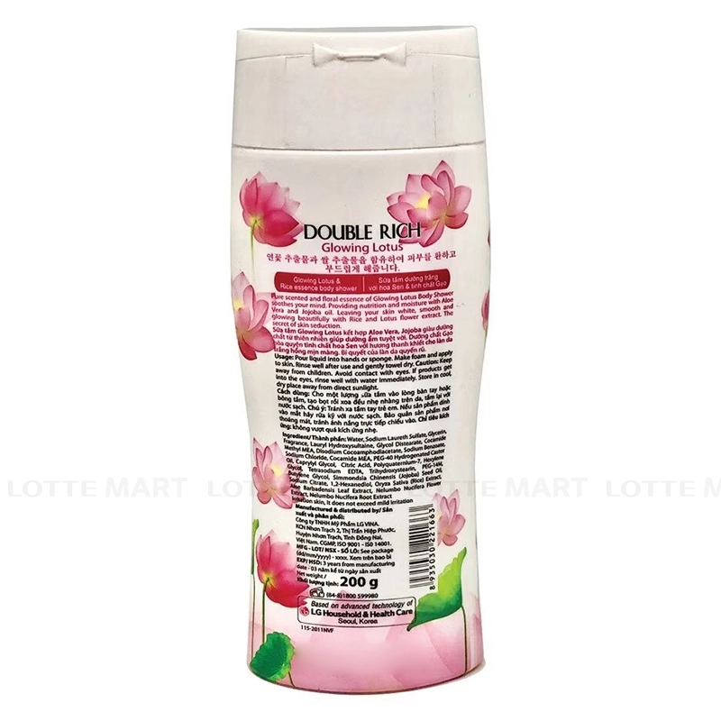 - Sữa tắm Double Rich Hoa Sen và Tinh Chất Gạo là sự kết hợp các thành phần thiên nhiên Aloe Vera, tinh dầu Jojoba, dưỡng chất gạo hòa quyện tinh chất hoa sen với hương thanh khiết cho làn da trắng hồng mịn màng.