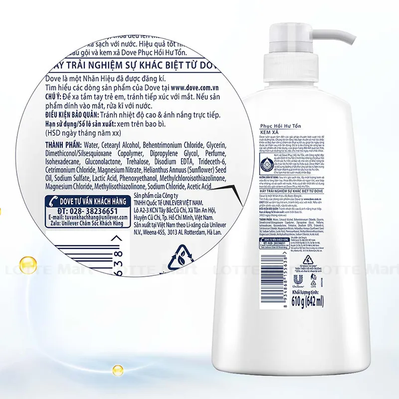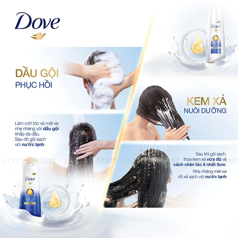 Hướng dẫn sử dụng Bước 1: Sau khi gội sạch tóc bằng dầu gội Dove cho một lượng vừa đủ kem xả ra lòng bàn tay. Nhẹ nhàng vuốt kem dọc theo chiều dài tóc. Lưu ý bôi kem xả cách chân tóc 5cm và không bôi vào da đầu. Bước 2: Xả sạch lại với nước ấm/ lạnh (không dùng nước nóng).