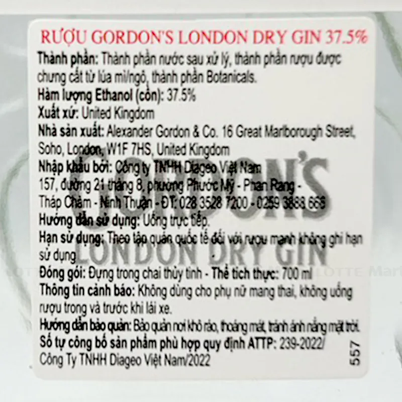 - Nồng độ cồn của Rượu Gordon's Gin là 37% cùng thiết kế chai rượu hài hòa, rất sang trọng phù hợp làm quà tặng biếu người thân, bạn bè trong các dịp lễ, Tết.
