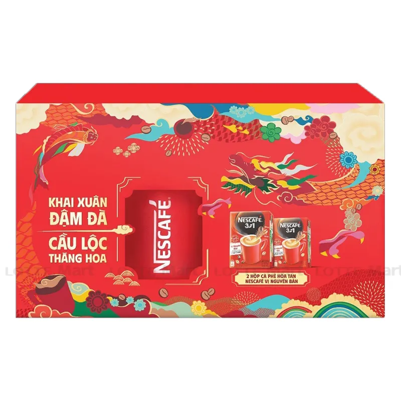 Hộp quà Tết Nescafe 3in1 Đậm Đà Hài Hòa bao gồm: 02 hộp NESCAFÉ 3 in1 Cà phê Rang xay hòa tan Đậm đà hài hòa và 01 Ly sứ đỏ cao cấp NESCAFÉ 3IN1 ĐẬM ĐÀ HÀI HOÀ.