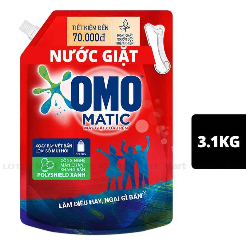 Nước Giặt Omo Matic Cửa Trên Bền Đẹp Túi 3.1kg không gây đóng cặn trên quần áo. Công thức màn chắn kháng bẩn Polyshield ưu việt, giúp phủ một lớp màn vô hình trên quần áo, giúp vết bẩn không thể bám sâu vào sợi vải và dễ dàng bị đánh bay khi giặt.
